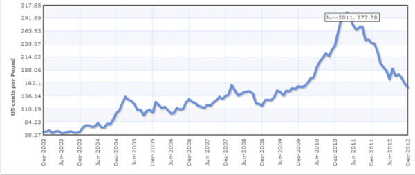 Currently, coffee prices have fallen to their lowest level since the middle of 2010 and have decreased significantly since the multi-year highs set in 2011. Dunkin’ and many competitors use Arabica beans for their coffee products. Below is a chart of the price of Arabica beans over the last 10 years: