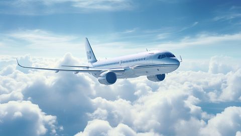 A modern commercial jet airliner decorated with the company logo in flight against a clear blue sky.