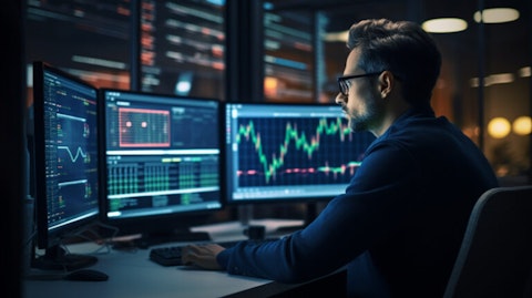 An experienced day trader at a modern trading workstation, looking intently at changing stock prices and reviewing portfolios.
