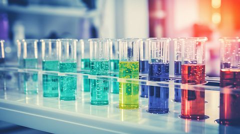A research laboratory arranged with a variety of test tubes filled with liquids for biopharmaceutical research.