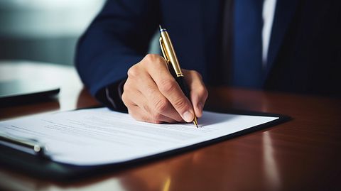 A close-up of a hand signing contracts in a board room, a symbol of efficient business decisions.