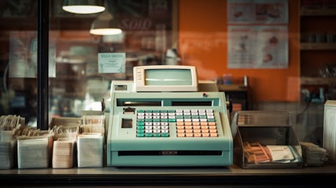 A close-up of a cash register, with passengers lined up at the window, illustrating the company’s payments and holdings. Editorial photo for a financial news article. 8k. –ar 16:9