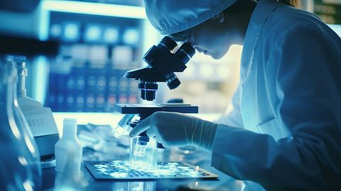 A doctor in a biomedical study laboratory examining cells under a microscope.