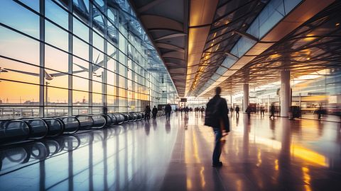 A traveler walking along a white-sand beach, a luxury resort in the background.