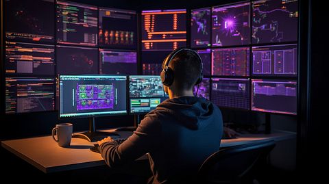 A programmer surrounded by multiple monitors, hands typing rapidly as the person creates code for an online casino game.