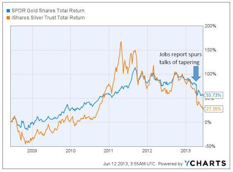 When the Fed decides to taper, there will be no need to print new money (hopefully). The dollar will strengthen, investors will not need such a high hedge against inflation, and precious metals will fall.