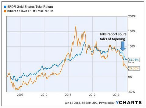 When the Fed decides to taper, there will be no need to print new money (hopefully). The dollar will strengthen, investors will not need such a high hedge against inflation, and precious metals will fall.