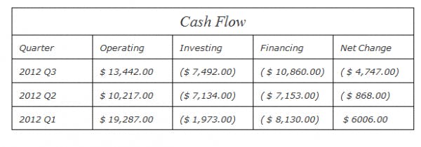Operating cash indicates if the company is able to generate its own cash, instead of funds coming from outside financing activities. As shown in the tables below, operating cash is growing year over year as of 2009, with a slight decrease in 2012.