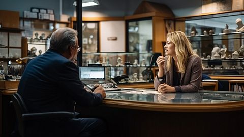 An employee in a pawn store, counting jewelry and consumer electronics that were pawned.