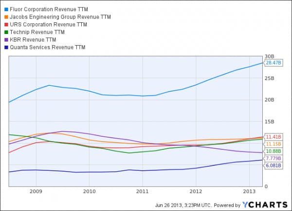 Things should change going forward. In what appears to be a robustly competitive engineering and construction market, Fluor Corporation (NEW) (NYSE:FLR) is the market leader, with nearly three times the revenue of any major peer.