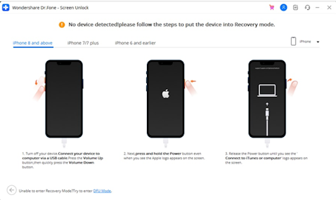 To kickstart the screen unlocking process, you need to put your iOS device into Recovery Mode. The instructions for doing that will be on the screen. As soon as your device is in Recovery Mode, it will detect the phone model. Now, choose the matching firmware version and hit “Start” to download it.