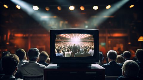 A close up of a television broadcasting a popular show produced by the company.
