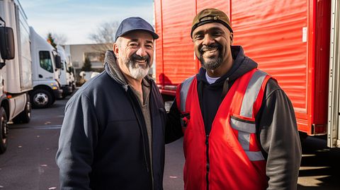 A delivery truck driver with a satisfied customer at the end of a successful delivery.