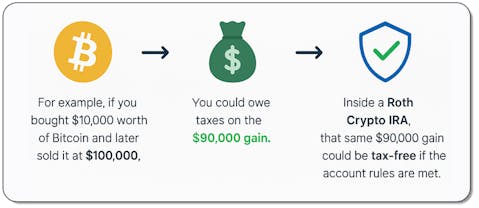 - For example, if you bought $10,000 worth of Bitcoin and later sold it at $100,000, you could owe taxes on the $90,000 gain. Inside a Roth Crypto IRA, that same $90,000 gain could be tax-free if the account rules are met.