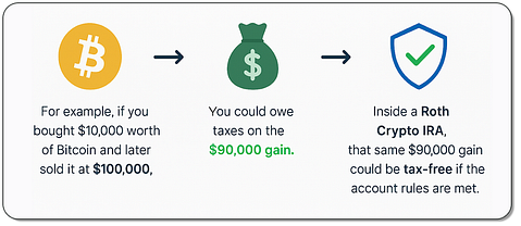 - For example, if you bought $10,000 worth of Bitcoin and later sold it at $100,000, you could owe taxes on the $90,000 gain. Inside a Roth Crypto IRA, that same $90,000 gain could be tax-free if the account rules are met.
