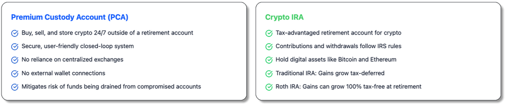 One company that consistently stands out in addressing these requirements is iTrustCapital. The platform makes it simple to buy and sell cryptocurrency while offering both secure Premium Custody Accounts and tax-advantaged* Crypto IRAs, giving investors confidence as they integrate digital assets into their long-term strategies.