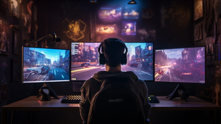 A gaming enthusiast in front of a widescreen monitor, lost in the game.