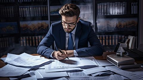 An investor in a business suit surrounded by financial documents, research and graphs.