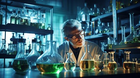 A scientist surrounded by a laboratory of chemicals and beakers, developing small molecular therapies.