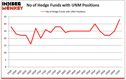 Unum Group (NYSE:UNM) was in 33 hedge funds’ portfolios at the end of March. The all time high for this statistic was previously 30. This means the bullish number of hedge fund positions in this stock currently sits at its all time high. UNM investors should pay attention to an increase in hedge fund interest in recent months. There were 25 hedge funds in our database with UNM positions at the end of the fourth quarter. Our calculations also showed that UNM isn’t among the 30 most popular stocks among hedge funds (click for Q1 rankings).