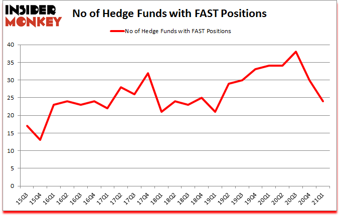 Is Fastenal Company (NASDAQ:FAST) undervalued? The smart money was cutting their exposure. The number of long hedge fund positions dropped by 6 lately. Fastenal Company (NASDAQ:FAST) was in 24 hedge funds’ portfolios at the end of the first quarter of 2021. The all time high for this statistic is 38. Our calculations also showed that FAST isn’t among the 30 most popular stocks among hedge funds (click for Q1 rankings). There were 30 hedge funds in our database with FAST positions at the end of the fourth quarter.