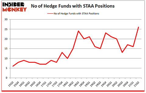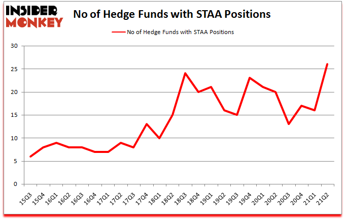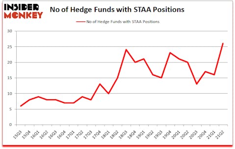 Heading into the third quarter of 2021, a total of 26 of the hedge funds tracked by Insider Monkey held long positions in this stock, a change of 63% from the first quarter of 2020. The graph below displays the number of hedge funds with bullish position in STAA over the last 24 quarters. So, let’s examine which hedge funds were among the top holders of the stock and which hedge funds were making big moves.