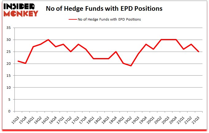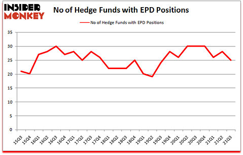 Enterprise Products Partners L.P. (NYSE:EPD) was in 25 hedge funds’ portfolios at the end of September. The all time high for this statistic is 30. EPD investors should pay attention to a decrease in hedge fund interest in recent months. There were 28 hedge funds in our database with EPD positions at the end of the second quarter. Our calculations also showed that EPD isn’t among the 30 most popular stocks among hedge funds (click for Q3 rankings).