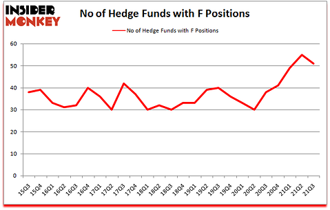 Ford Motor Company (NYSE:F) shareholders have witnessed a decrease in hedge fund sentiment in recent months. Ford Motor Company (NYSE:F) was in 51 hedge funds’ portfolios at the end of September. The all time high for this statistic is 55. There were 55 hedge funds in our database with F holdings at the end of June. Our calculations also showed that F isn’t among the 30 most popular stocks among hedge funds (click for Q3 rankings).