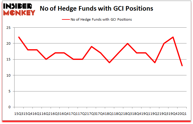 At Q1’s end, a total of 13 of the hedge funds tracked by Insider Monkey were bullish on this stock, a change of -41% from the previous quarter. By comparison, 17 hedge funds held shares or bullish call options in GCI a year ago. So, let’s check out which hedge funds were among the top holders of the stock and which hedge funds were making big moves.