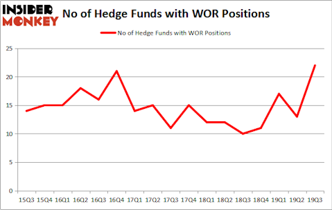 Heading into the fourth quarter of 2019, a total of 22 of the hedge funds tracked by Insider Monkey held long positions in this stock, a change of 69% from one quarter earlier. Below, you can check out the change in hedge fund sentiment towards WOR over the last 17 quarters. With the smart money’s capital changing hands, there exists a select group of noteworthy hedge fund managers who were increasing their holdings meaningfully (or already accumulated large positions).