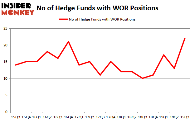 Heading into the fourth quarter of 2019, a total of 22 of the hedge funds tracked by Insider Monkey held long positions in this stock, a change of 69% from one quarter earlier. Below, you can check out the change in hedge fund sentiment towards WOR over the last 17 quarters. With the smart money’s capital changing hands, there exists a select group of noteworthy hedge fund managers who were increasing their holdings meaningfully (or already accumulated large positions).