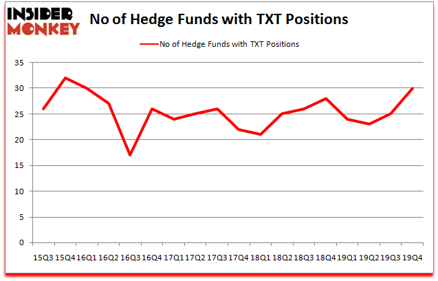 Textron Inc. (NYSE:TXT) was in 30 hedge funds’ portfolios at the end of the fourth quarter of 2019. TXT investors should be aware of an increase in enthusiasm from smart money recently. There were 25 hedge funds in our database with TXT holdings at the end of the previous quarter. Our calculations also showed that TXT isn’t among the 30 most popular stocks among hedge funds (click for Q4 rankings and see the video at the end of this article for Q3 rankings).