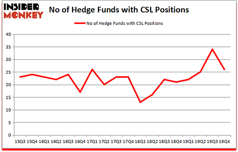 Heading into the first quarter of 2020, a total of 26 of the hedge funds tracked by Insider Monkey held long positions in this stock, a change of -24% from one quarter earlier. On the other hand, there were a total of 21 hedge funds with a bullish position in CSL a year ago. With hedge funds’ positions undergoing their usual ebb and flow, there exists an “upper tier” of noteworthy hedge fund managers who were boosting their holdings significantly (or already accumulated large positions).