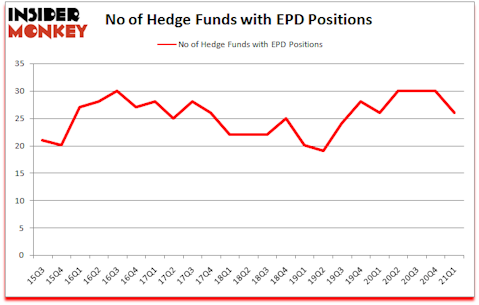 Is Enterprise Products Partners L.P. (NYSE:EPD) the right investment to pursue these days? Prominent investors were taking a pessimistic view. The number of bullish hedge fund bets fell by 4 lately. Enterprise Products Partners L.P. (NYSE:EPD) was in 26 hedge funds’ portfolios at the end of the first quarter of 2021. The all time high for this statistic is 30. Our calculations also showed that EPD isn’t among the 30 most popular stocks among hedge funds (click for Q1 rankings).