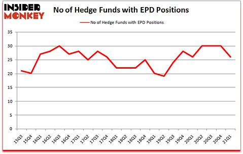 Is Enterprise Products Partners L.P. (NYSE:EPD) the right investment to pursue these days? Prominent investors were taking a pessimistic view. The number of bullish hedge fund bets fell by 4 lately. Enterprise Products Partners L.P. (NYSE:EPD) was in 26 hedge funds’ portfolios at the end of the first quarter of 2021. The all time high for this statistic is 30. Our calculations also showed that EPD isn’t among the 30 most popular stocks among hedge funds (click for Q1 rankings).
