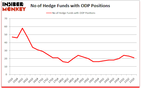 The ODP Corporation (NASDAQ:ODP) was in 21 hedge funds’ portfolios at the end of the third quarter of 2021. The all time high for this statistic is 58. ODP investors should be aware of a decrease in hedge fund interest of late. There were 23 hedge funds in our database with ODP positions at the end of the second quarter. Our calculations also showed that ODP isn’t among the 30 most popular stocks among hedge funds (click for Q2 rankings).