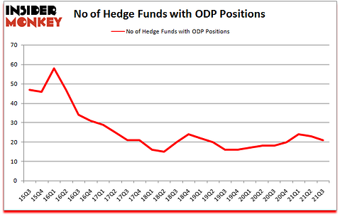 The ODP Corporation (NASDAQ:ODP) was in 21 hedge funds’ portfolios at the end of the third quarter of 2021. The all time high for this statistic is 58. ODP investors should be aware of a decrease in hedge fund interest of late. There were 23 hedge funds in our database with ODP positions at the end of the second quarter. Our calculations also showed that ODP isn’t among the 30 most popular stocks among hedge funds (click for Q2 rankings).