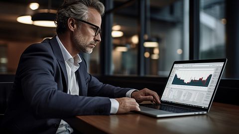 A portfolio manager intently comparing investment grade securities on a laptop.