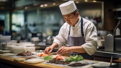 The chef of the Japanese restaurant preparing a meal at the counter.