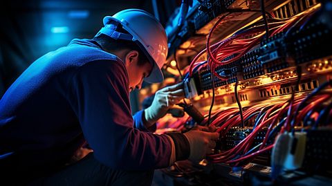 Close up view of a technician using specialized tools to install a fiber optic cable line.