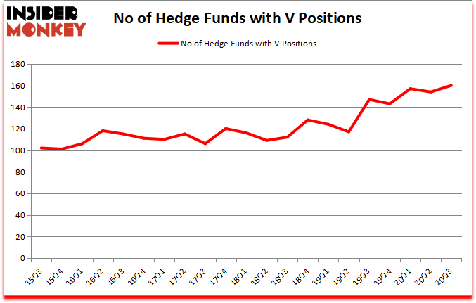 Is Visa Inc (NYSE:V) going to take off soon? Investors who are in the know were taking a bullish view. The number of bullish hedge fund positions increased by 6 in recent months. Visa Inc (NYSE:V) was in 160 hedge funds’ portfolios at the end of the third quarter of 2020. The all time high for this statistics prior to this quarter was 157. This means the bullish number of hedge fund positions in this stock currently sits at its all time high. Our calculations also showed that V ranks 6th among the 30 most popular stocks among hedge funds (click for Q3 rankings and see the video for a quick look at the top 5 stocks).