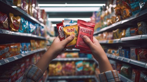 A hand reaching out to grab a packet of confectionery products from an overflowing display shelf.