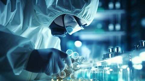 A Biopharma Scientist at a laboratory bench examining a sample under a microscope.