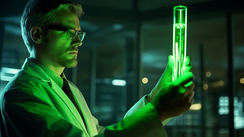 A researcher in a lab coat holding up a test tube filled with a glowing green liquid, symbolizing the clinical-stage biopharmaceutical company’s research into cardiovascular disease treatments.