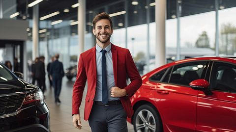 A customer smiling delightedly after driving away in their new car from the automotive retail shop.