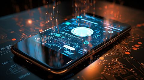 A close-up of a smart connected device, with code written in the background.