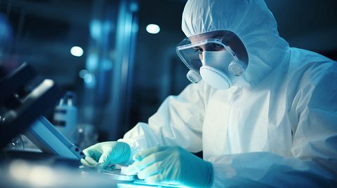 A laboratory scientist in personal protective equipment studying samples of Covid-19.