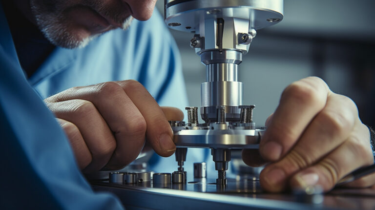 A close-up of a technician inspecting and testing a dispensing closure component.