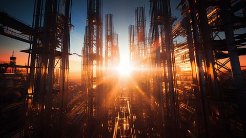 Aerial view of highly-engineered steel towers, with their intricate frameworks shining in the sun.