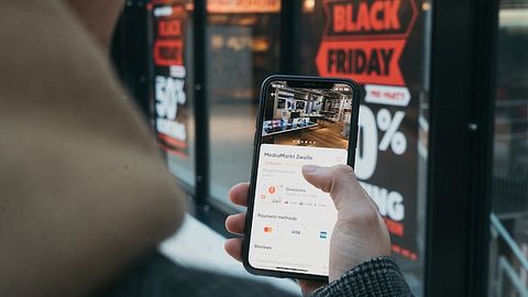 A customer using their phone to access an online commerce platform.